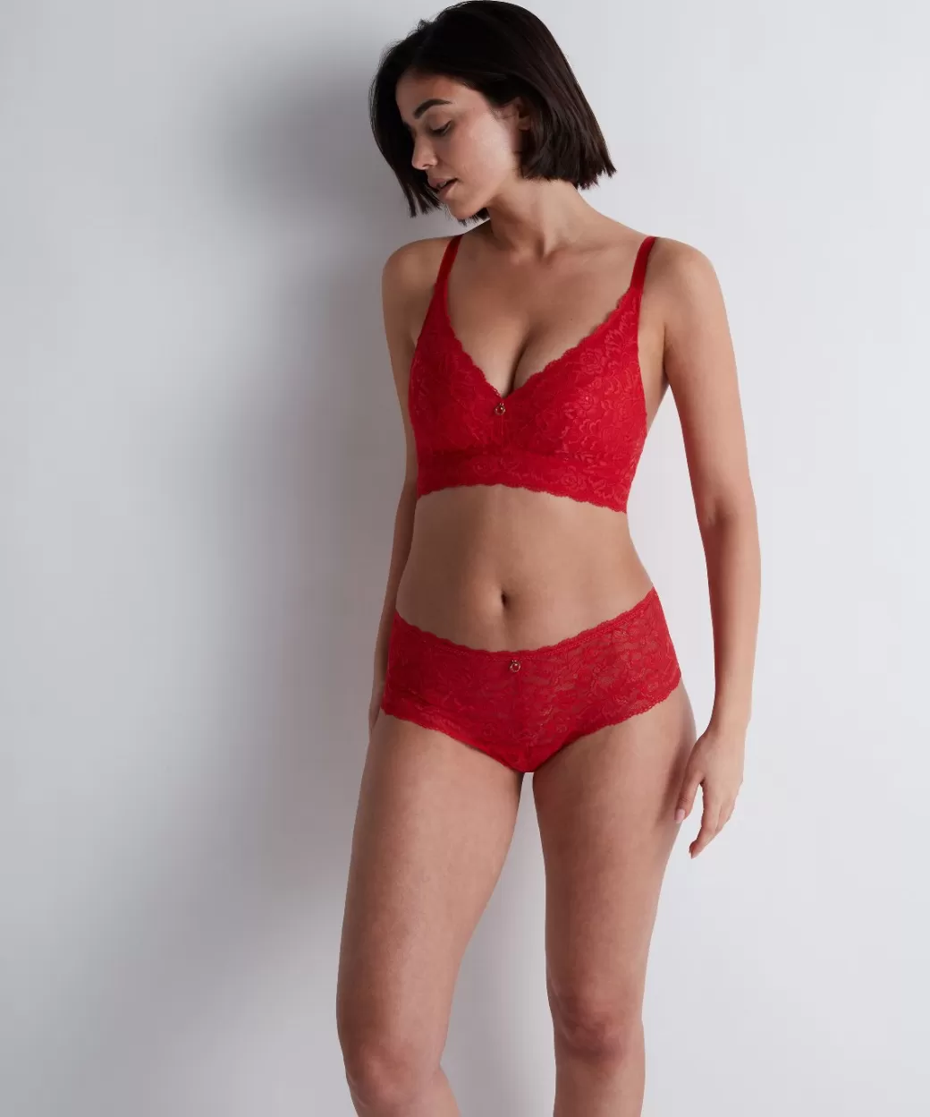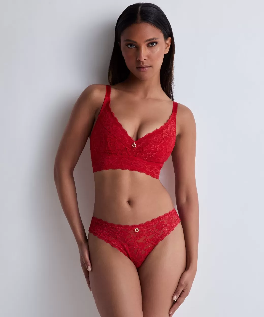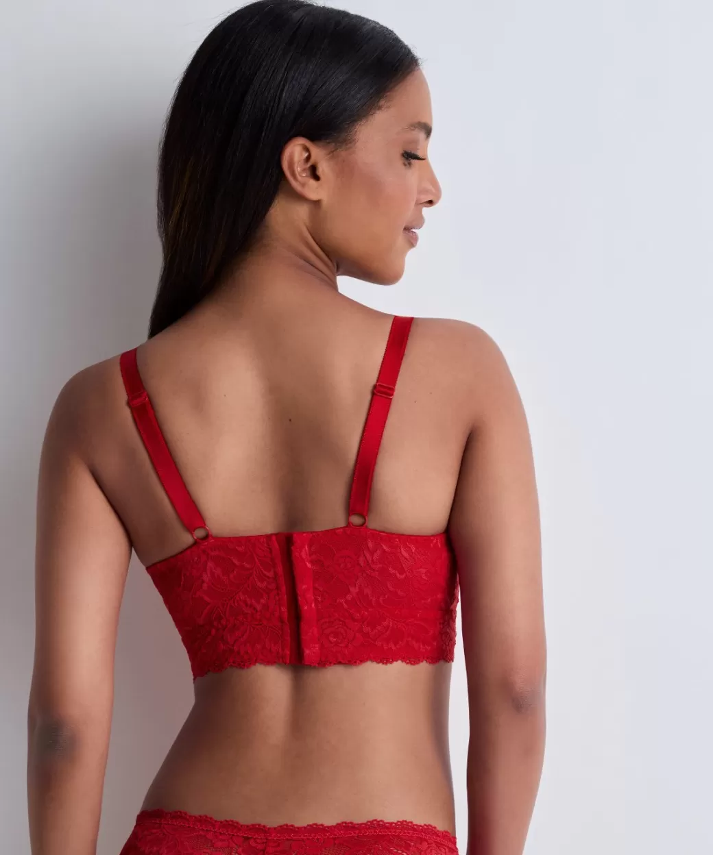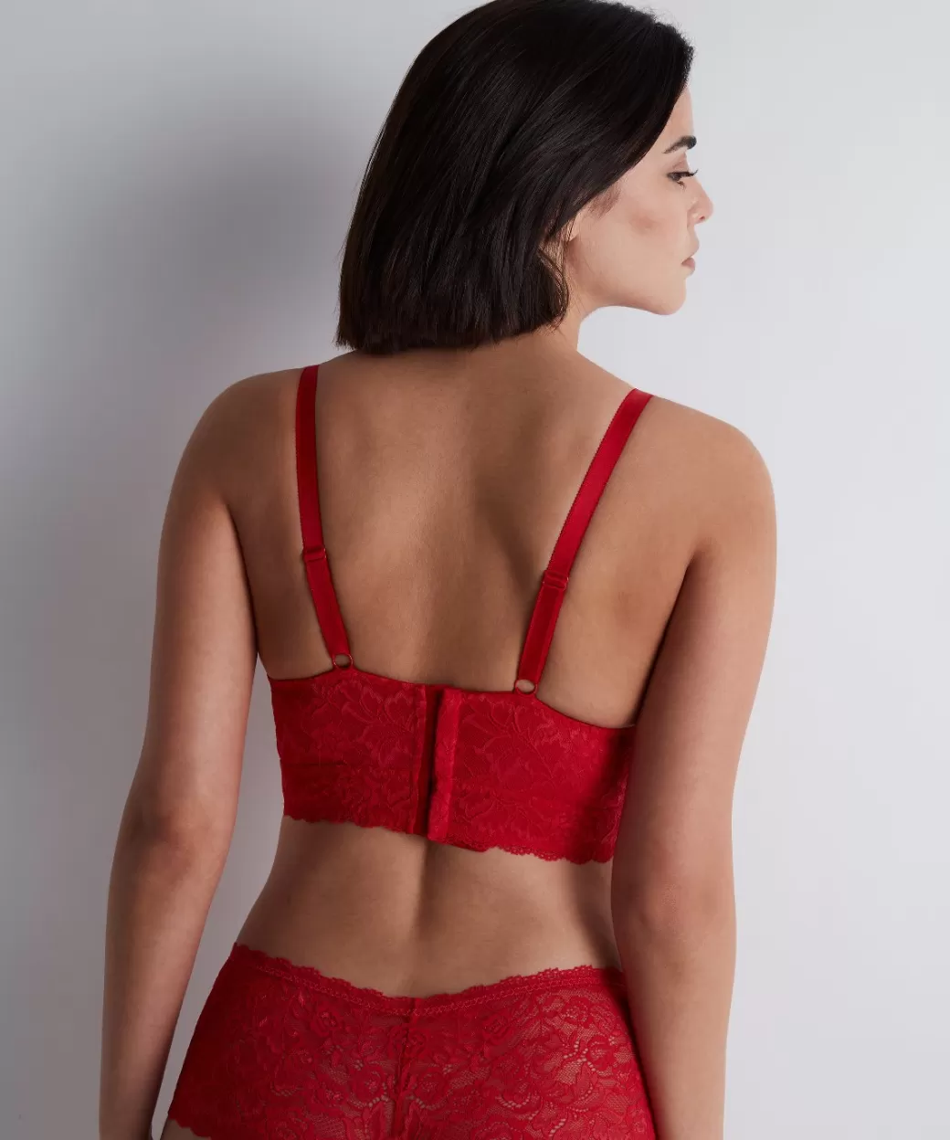 Sans armatures, le soutien-gorge triangle brassière confort Rosessencedéploie une dentelle florale élégante de l’épaule à la taille dans une forme bustier moderne qui assure un maintien optimal. Sexy, il offre un dos largement ouvert et un décolleté profond, souligné à l’entregorge par un bijou doré avec strass élégant.
