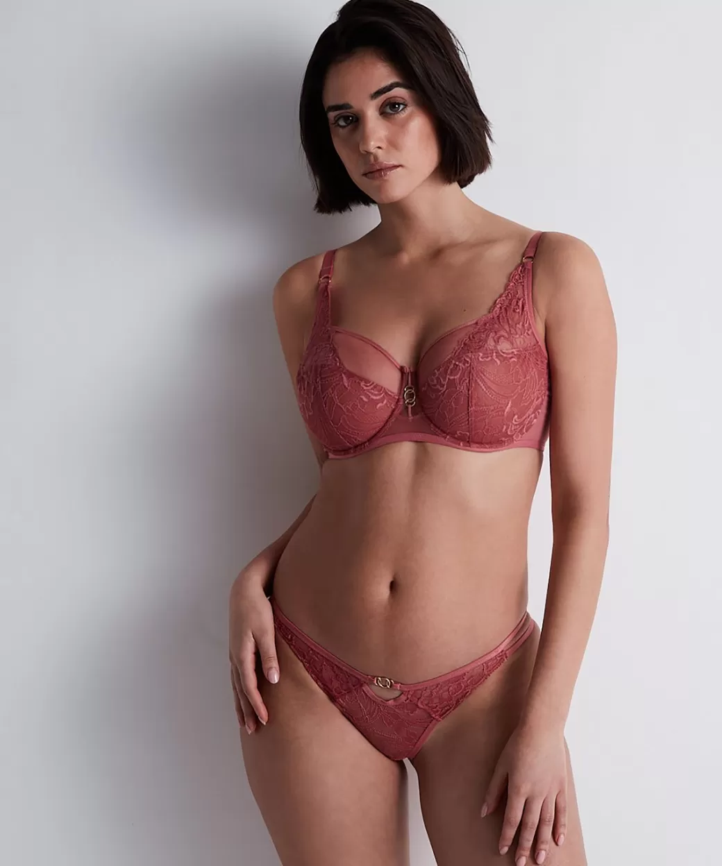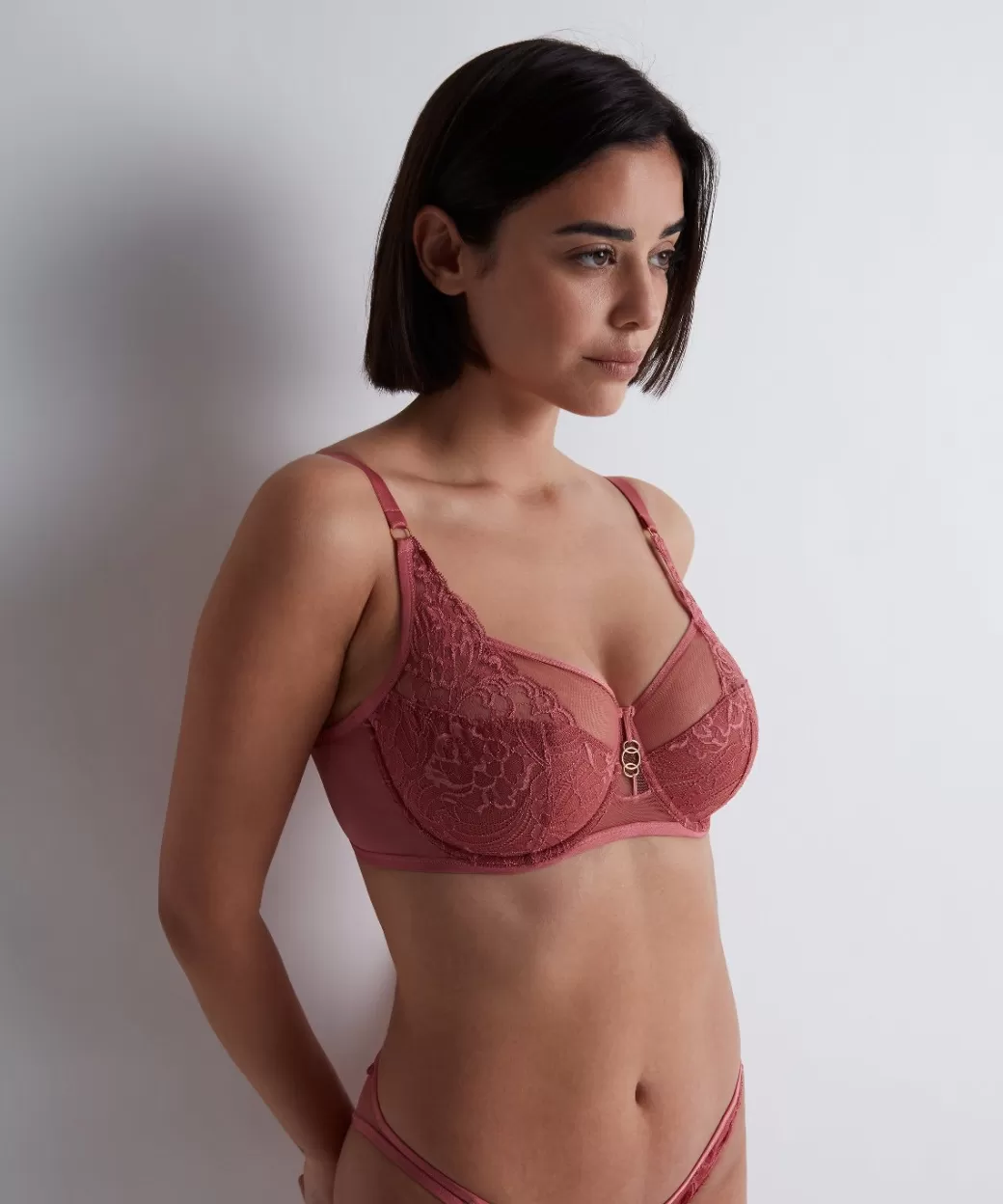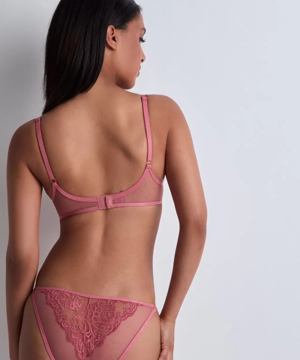 Avec son dos cheminée confortable qui assure un maintien optimal au quotidien, le soutien-gorge emboîtant foulard Feeling Myself s’adapte aux poitrines les plus généreuses, leur conférant un galbe résolument séduisant. Jouant la transparence entre dentelle et tulle, il se pare à l’entregorge d’un bijou doré martelé original et moderne.