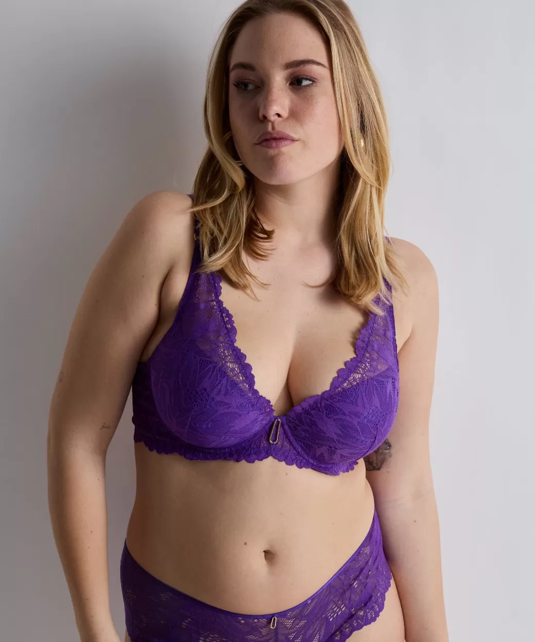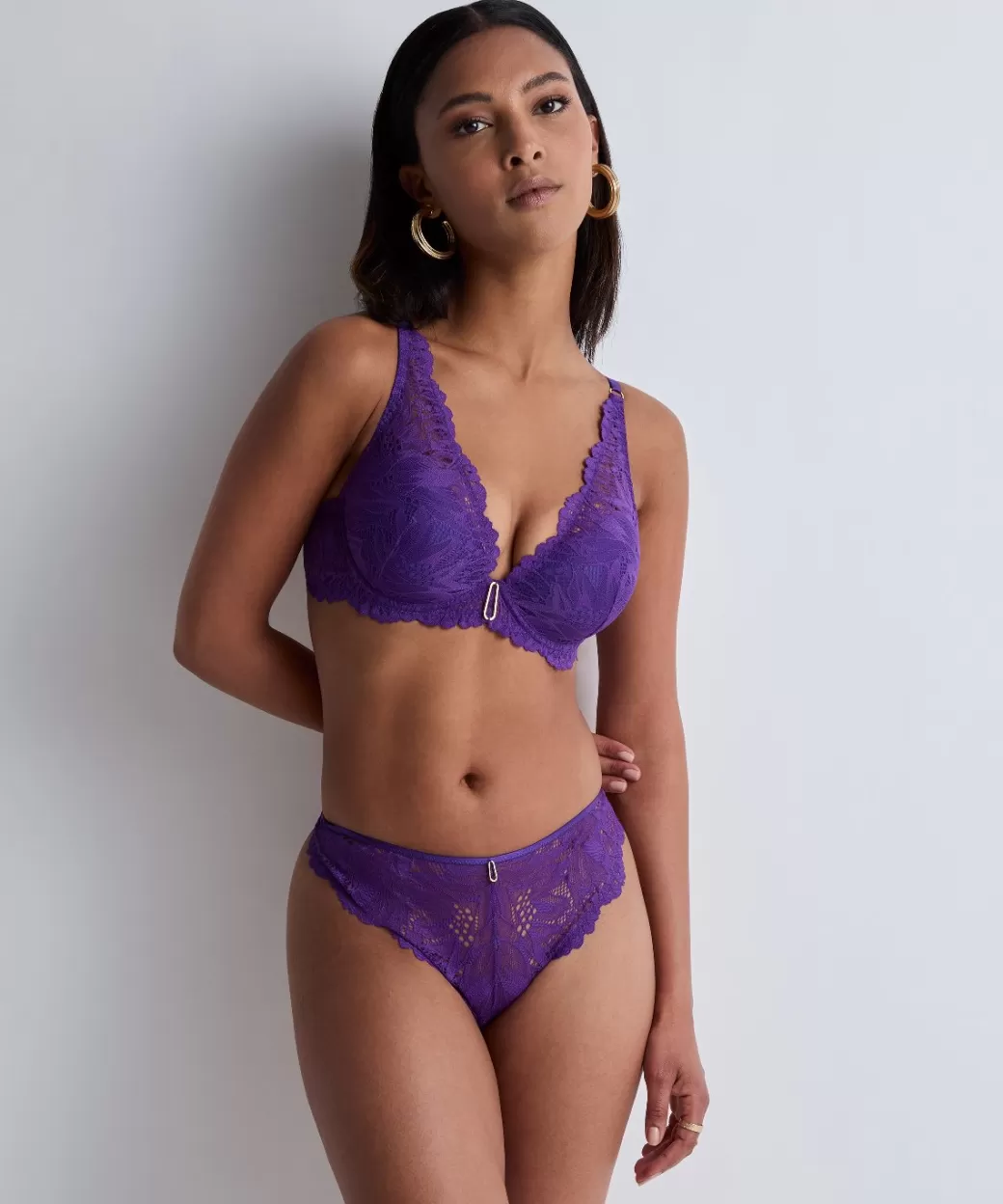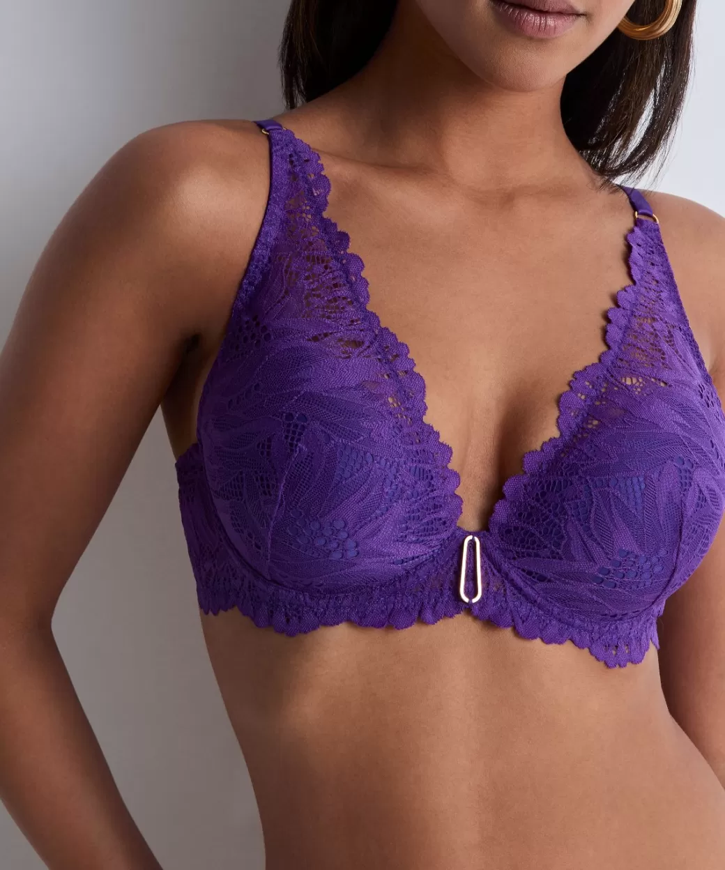 Sexy et confortable avec ses coques intégrées ton sur ton et sa forme couvrante, le soutien-gorge plunge foulard Flowermania offre un décolleté profond, sublimé par un bijou doré à l’entregorge. Sa dentelle montant haut sur la poitrine, il en souligne tout le galbe pour un effet push-up naturel très séduisant.