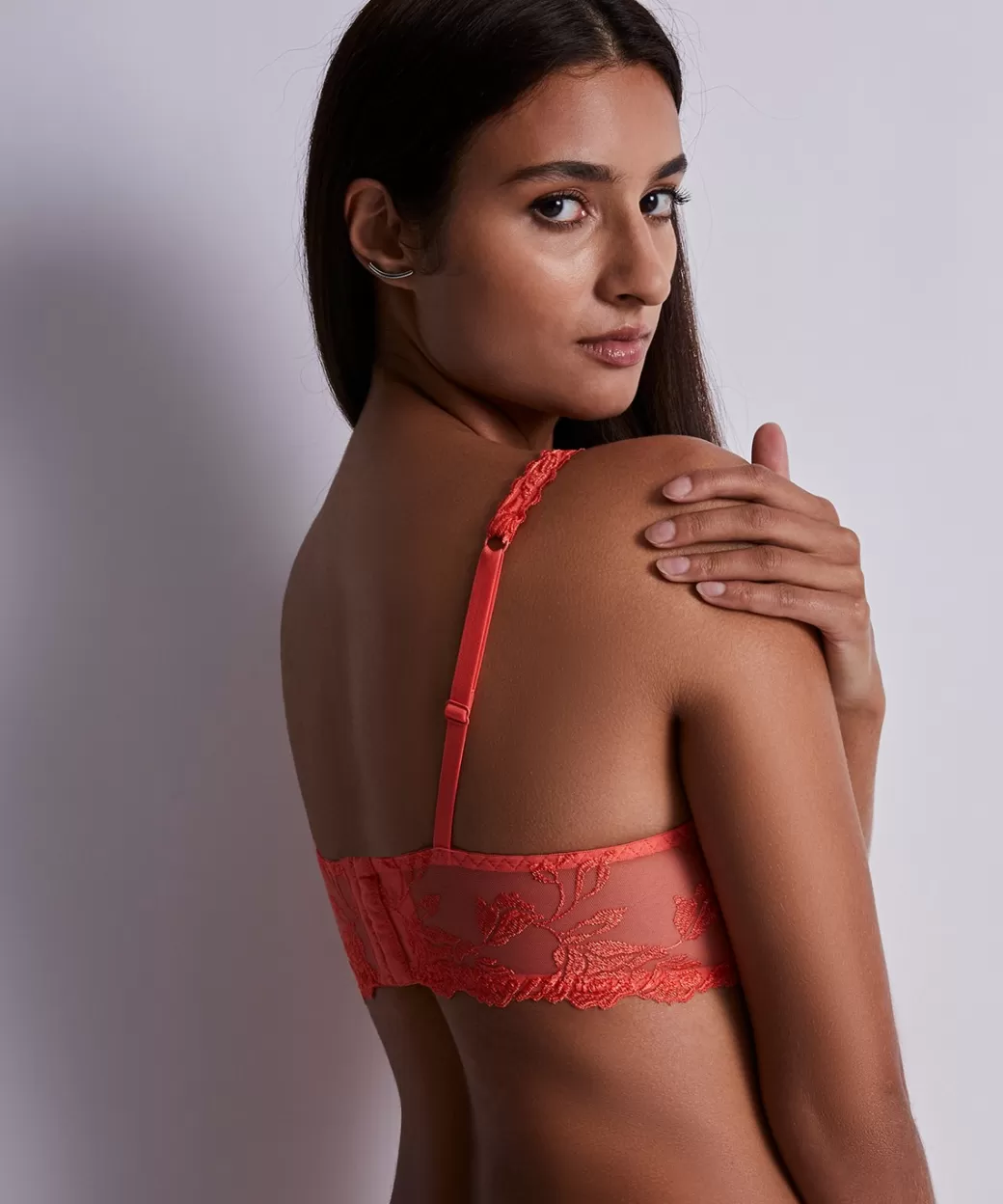Structurant le buste de sa broderie florale qui se poursuit sur les bretelles et le dos, le soutien-gorge corbeille arma…