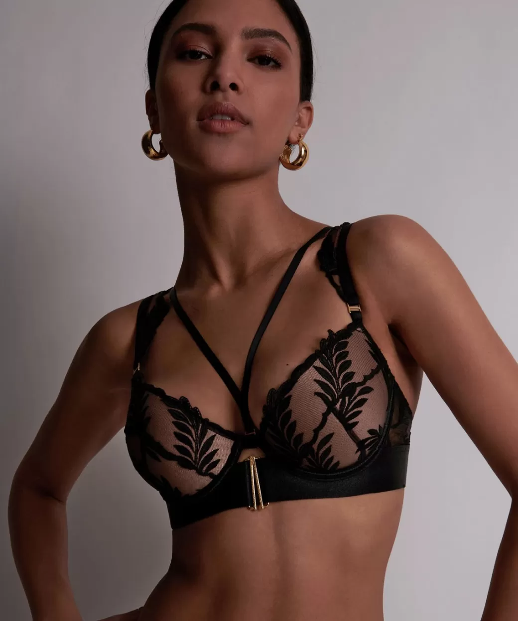 Offrant un confort optimal avec ses coques intégrées, le soutien-gorge plunge coque Queen of Shadow dessine un décolleté profond et sexy jusqu’au bonnet E. Tour du cou amovible, bretelles habillées de broderie, bijou à l’entregorge, bandes graphiques dans le dos… Tout est pensé pour offrir un effet sensuel et irrésistible.