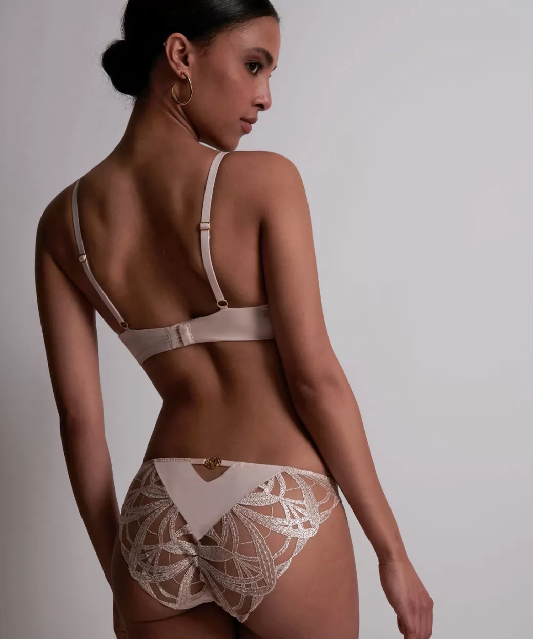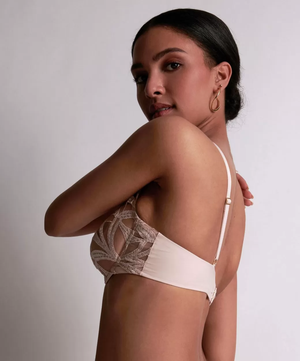 Le soutien-gorge triangle ultra plunge Elie Saab x Aubade allie broderie sculpturale aux touches perlées de lurex, détail doré à l’entregorge et dos en tissu mat léger très moderne. Déployant sa matière haut sur le buste, il offre une forme couvrante et confortable à l’effet seconde peau très sensuel.